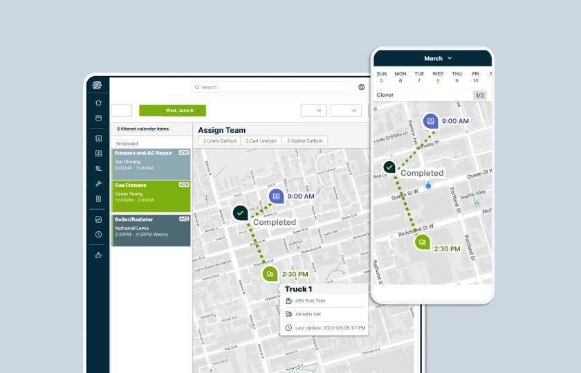 - Scheduling – Drag-and-drop work orders, color-coded calendars, dispatch route mapping, and automated “on my way” texts with GPS tracking.