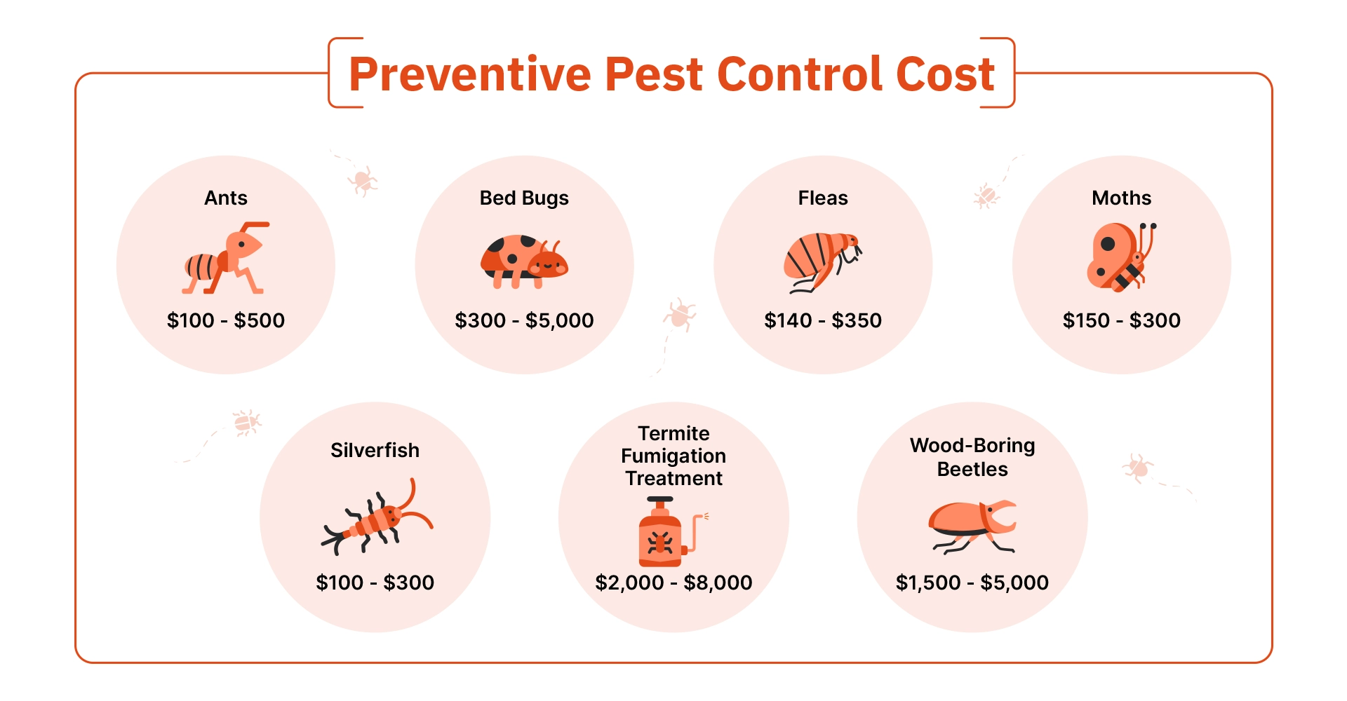 During the first appointment, the focus is primarily on conducting a thorough inspection and identifying the problem. As the severity of the infestation and the required treatment become clearer, the pricing can vary accordingly. So, the cost of the initial visit and the follow-up visits are lower compared to the treatment cost. Find below the average cost of pest control services for common residential pests to get a better idea of what to expect.