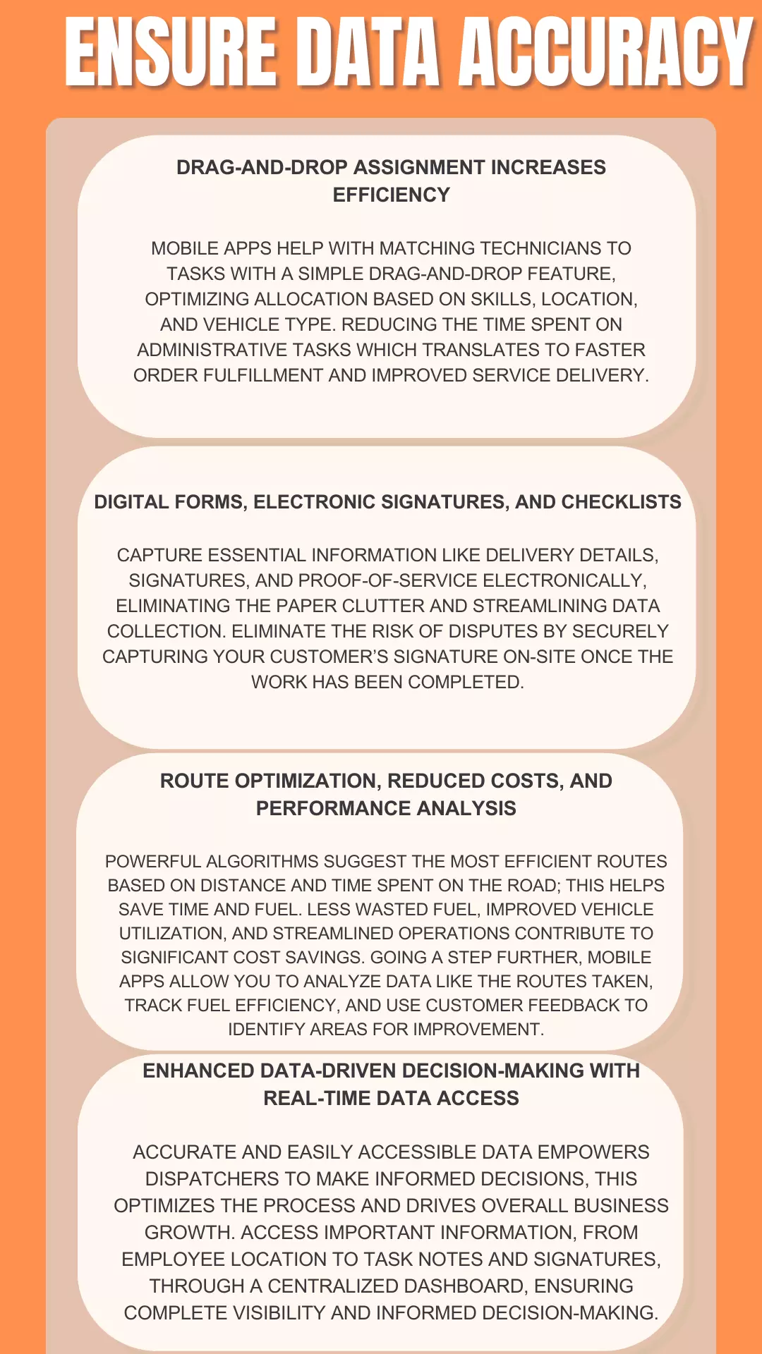 Mobile apps leverage GPS technology and real-time data, allowing customers to receive accurate ETAs, set expectations, and reduce frustration. They provide real-time tracking, allowing your customers to visualize the driver’s progress and even predict arrival times within minutes; this helps you build trust, and reduce customer anxiety and frustration. With mobile apps, your technicians are carrying a digital toolbox with them providing access to work orders, detailed customer information, equipment manuals, and troubleshooting guides, all accessible at their fingertips. An empowered technician translates to faster service completion, minimized downtime, and satisfied customers who receive prompt and efficient service. Dispatchers can analyze driver performance, identify optimal routes, and predict potential issues, making data-driven decisions that continuously improve operations and minimize costs. This constant loop of learning and optimization ensures long-term success and a competitive edge in the ever-evolving logistics landscape.