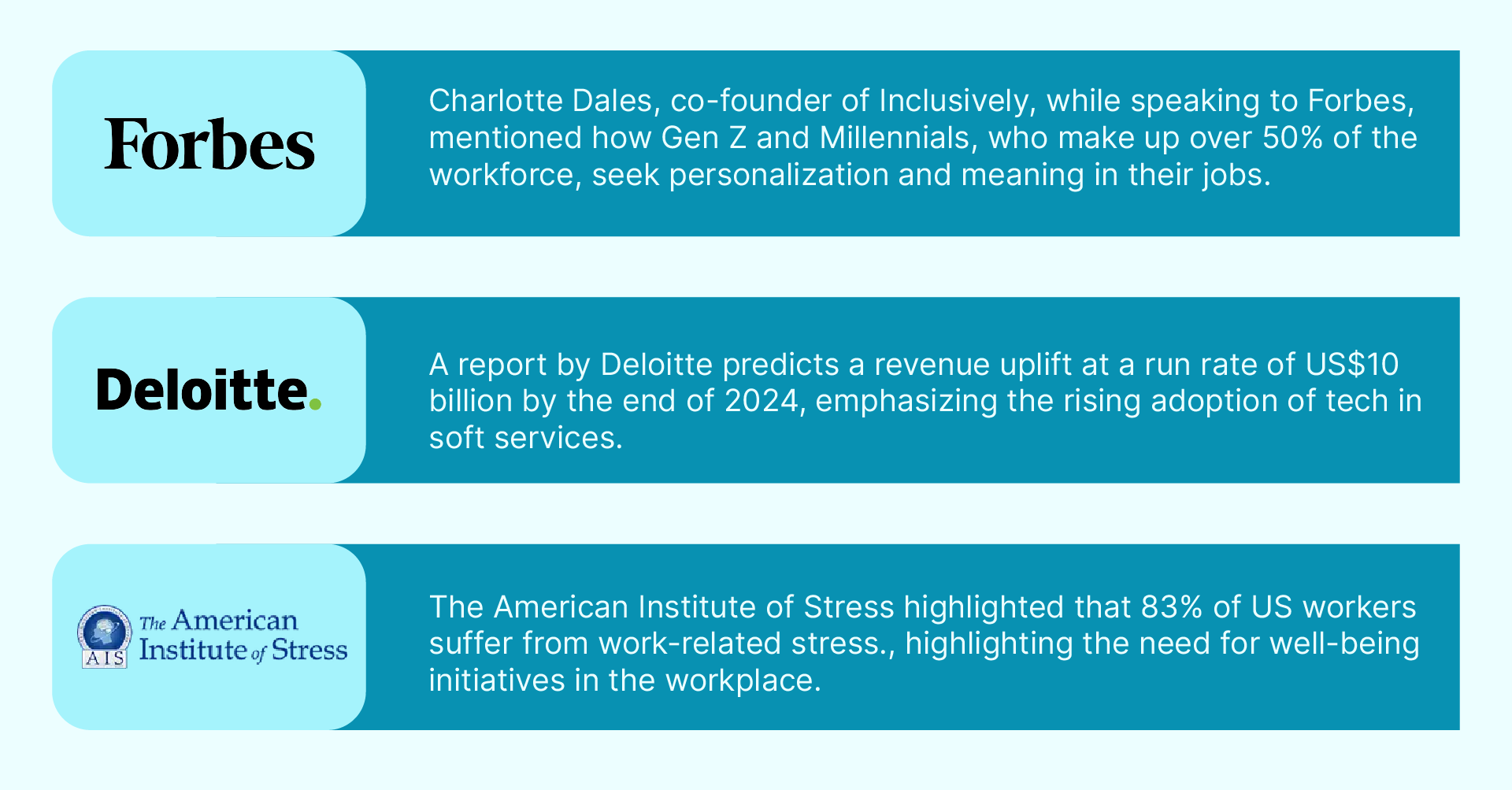 Technology integration: Optimizes service delivery and occupant experience by utilizing mobile apps for service requests, real-time communication, and data-driven insights. A report by Deloitte predicts a revenue uplift at a run rate of $10 billion by the end of 2024, emphasizing the rising adoption of tech in soft services.
