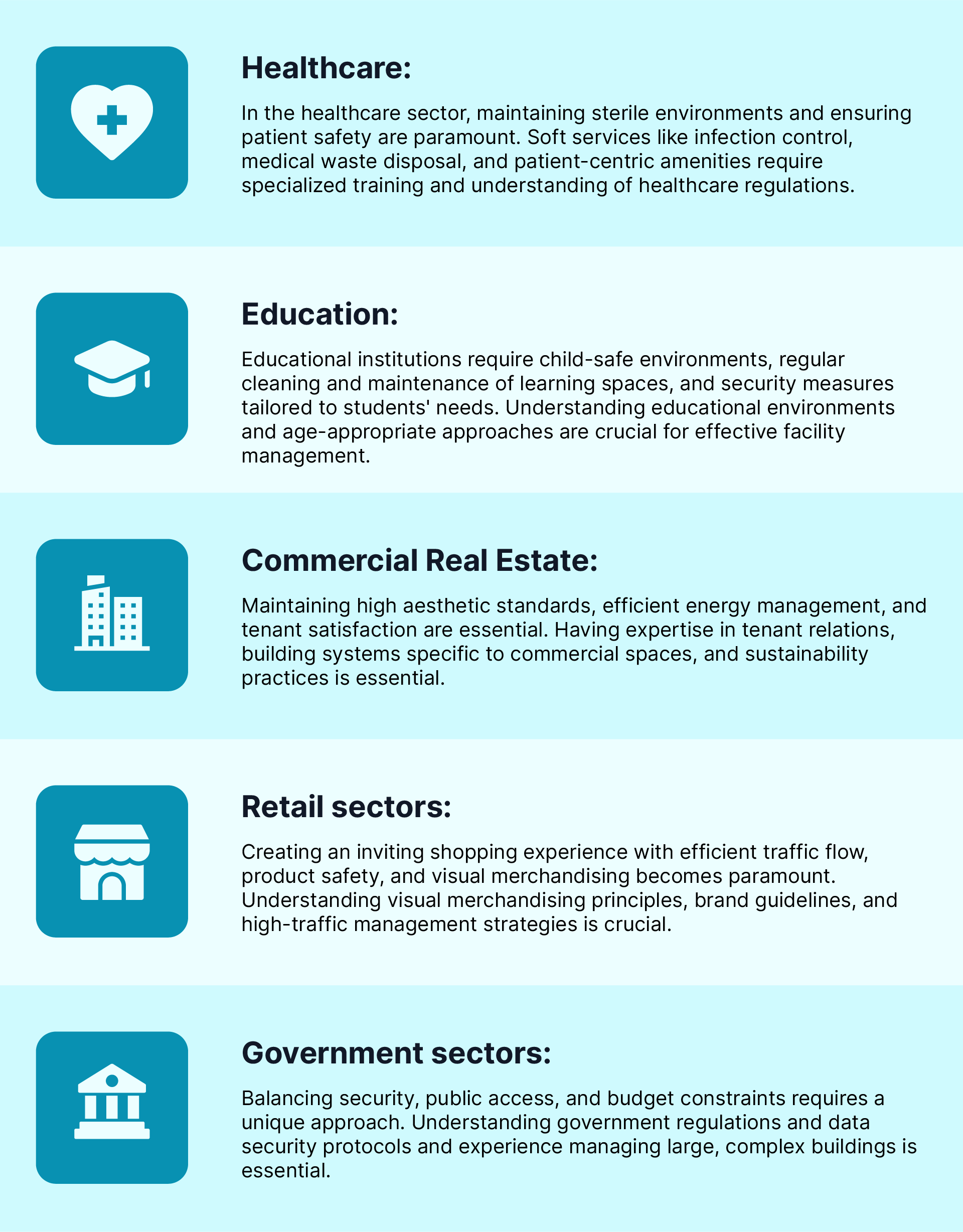 Facility management demands a different approach, catering to the unique needs of various industries. While “hard” services like maintenance remain crucial across the board, “soft” hospitality-focused services require specific expertise depending on the sector. Let’s get into industry-specific focuses and the importance of specialized knowledge:
