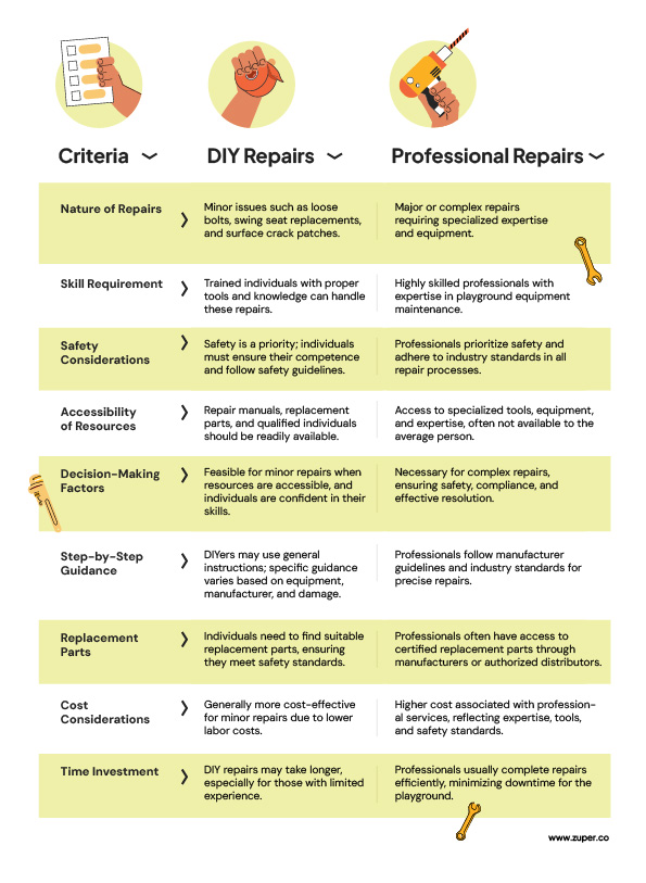 While some minor repairs, like tightening loose bolts or replacing swing seats, can be tackled by untrained individuals with the proper tools, prioritizing safety is paramount. Here’s where the decision between DIY and professional intervention becomes crucial: