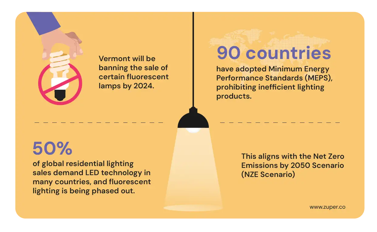 In 2024, the revenue generated in the lighting market in the United States amounted to $30.66 billion. According to the projected Compound Annual Growth Rate (CAGR) from 2024 to 2028, the market is expected to grow by 3.78% annually. The United States is undergoing a lighting revolution where Federal regulations are being updated, and states like Vermont are leading the charge—banning the sale of certain types of fluorescent lamps by 2024. This shift paves the way for LED adoption across the country and the world. The global shift to energy-efficient lighting is upon us, with nearly 90 countries having adopted Minimum Energy Performance Standards (MEPS), effectively banning inefficient lighting products. This has dramatically reduced lighting energy consumption worldwide, with almost 80% covered by such standards and a notably high adoption rate of 90% in the United States, Europe, and China.