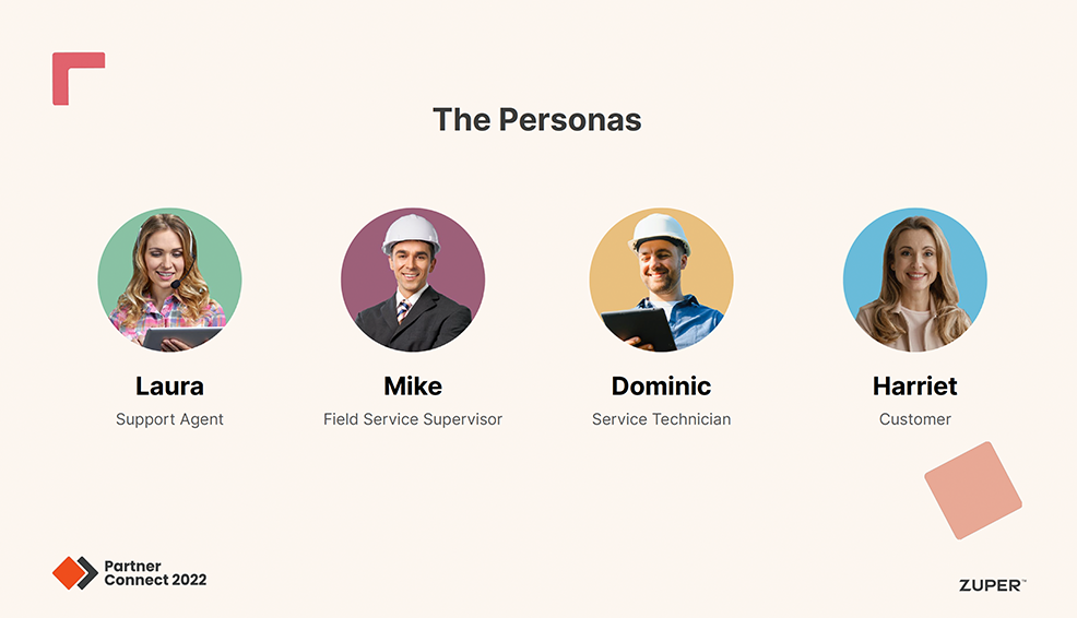 Laura is the Support Agent who takes the customer calls, tries to provide remote assistance and operates on the Zendesk ticket. Mike is our Field Service Supervisor who is registered as a user within the Zuper system. He dispatches the right technician to the customer’s location. Dominic is the Field Technician who specializes in a specific skill and performs the actual service. Harriet is the customer looking for service.