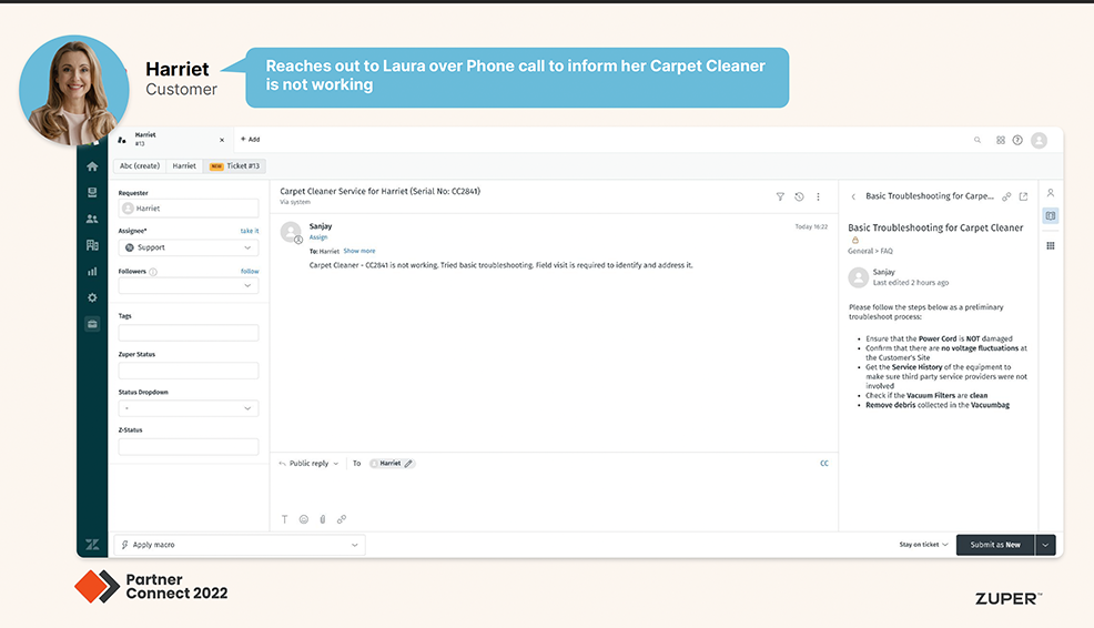 Harriet reaches out to Laura over the phone to raise her concern that the carpet cleaner she purchased from Go Clean is not working lately. As a first step Laura tries to offer remote assistance by referring to the knowledge base that is available within Zendesk. She helps Harriet to check to see if the power cord of the carpet cleaner is damaged or if there is voltage fluctuation at her home. She also makes sure that the filters of the vacuum cleaner are clean and are not damaged. After completing the troubleshooting Laura comes to the conclusion that a field visit is required to identify and fix the issue with the carpet cleaner.