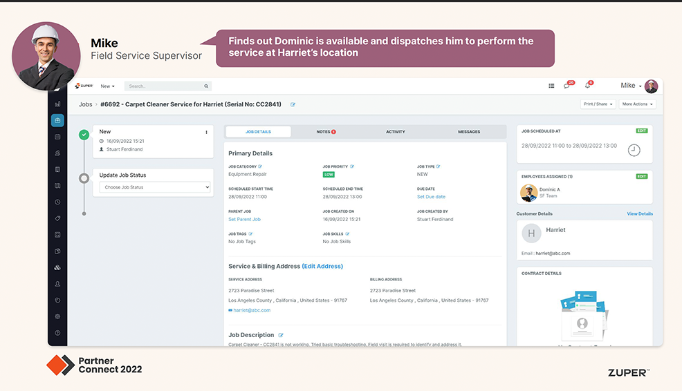 From Zendesk, Mike sees this job and tries to understand the issue by going through the job description and the notes that were added from Zendesk. He finds out that Dominic is skilled in servicing the carpet cleaner and also available at the specified time. Mike updates the status of the job as confirmed and assigns this job to Dominic.