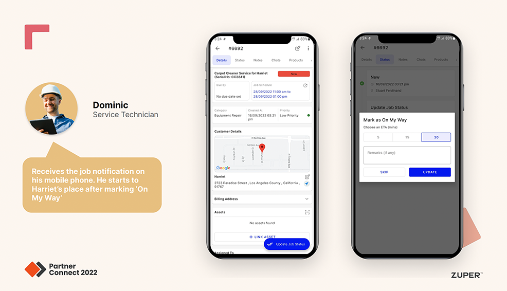 Dominic gets notified on his Zuper Pro mobile app. When he starts out for Harriet’s location, he marks the status of the job as “On my way” and fills in the ETA to reach his destination.