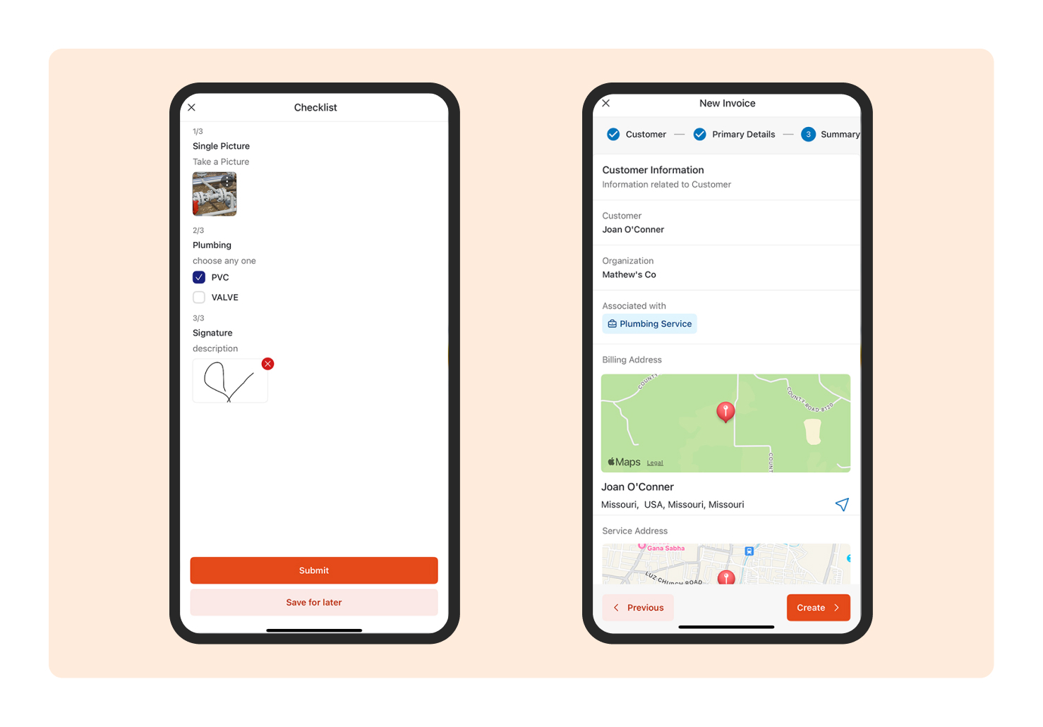 Forms and checklists within a mobile field service app ensure consistent, high-quality service inspections across your entire team. Built-in inspection forms provide your technicians with a step-by-step guide and deductive questionnaires, ensuring they follow the correct procedures and identify potential issues. You can easily attach templates for specific situations to work orders, streamlining the process.