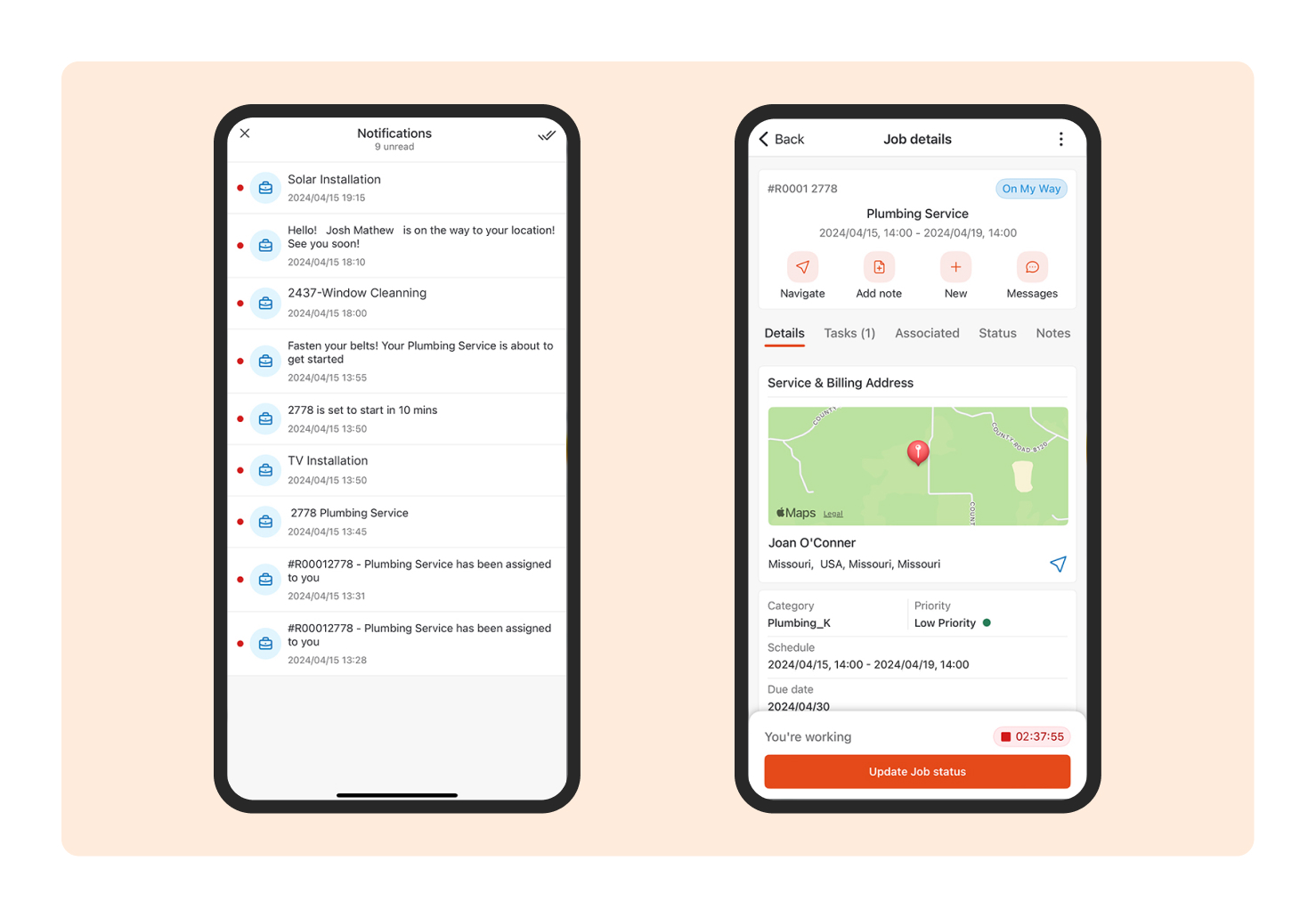 With a mobile field service app, technicians can easily view, access, and manage jobs, work orders, routes, and invoices assigned to them. From their mobile app, technicians have real-time access to all their tasks—always up-to-date with the latest information about job’s, customers, and locations. The app provides detailed information about each job, including customer details, service history, equipment specifics, and work requirements. If a field service technician updates his job status to “Started the job” and later “Completed” through the mobile app, it instantly syncs with the field service management software. Dispatchers can view these updates in real-time, streamlining communication and record keeping and ensuring everyone is on the same page.