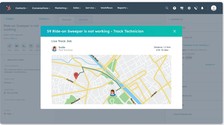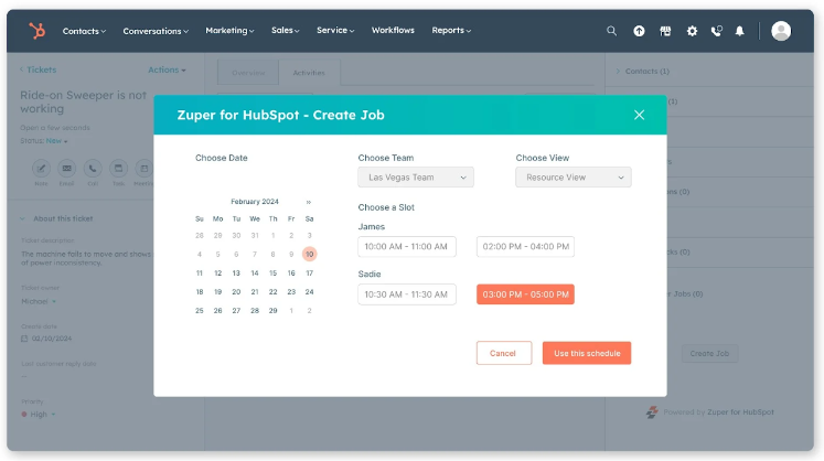 Schedule jobs according to urgency and dispatch service technicians according to their skills, location, and availability. HubSpot on mobile shows the Zuper widget right on the ticket screen, so technicians can convert deals and service requests to work orders in the field, all from one place.