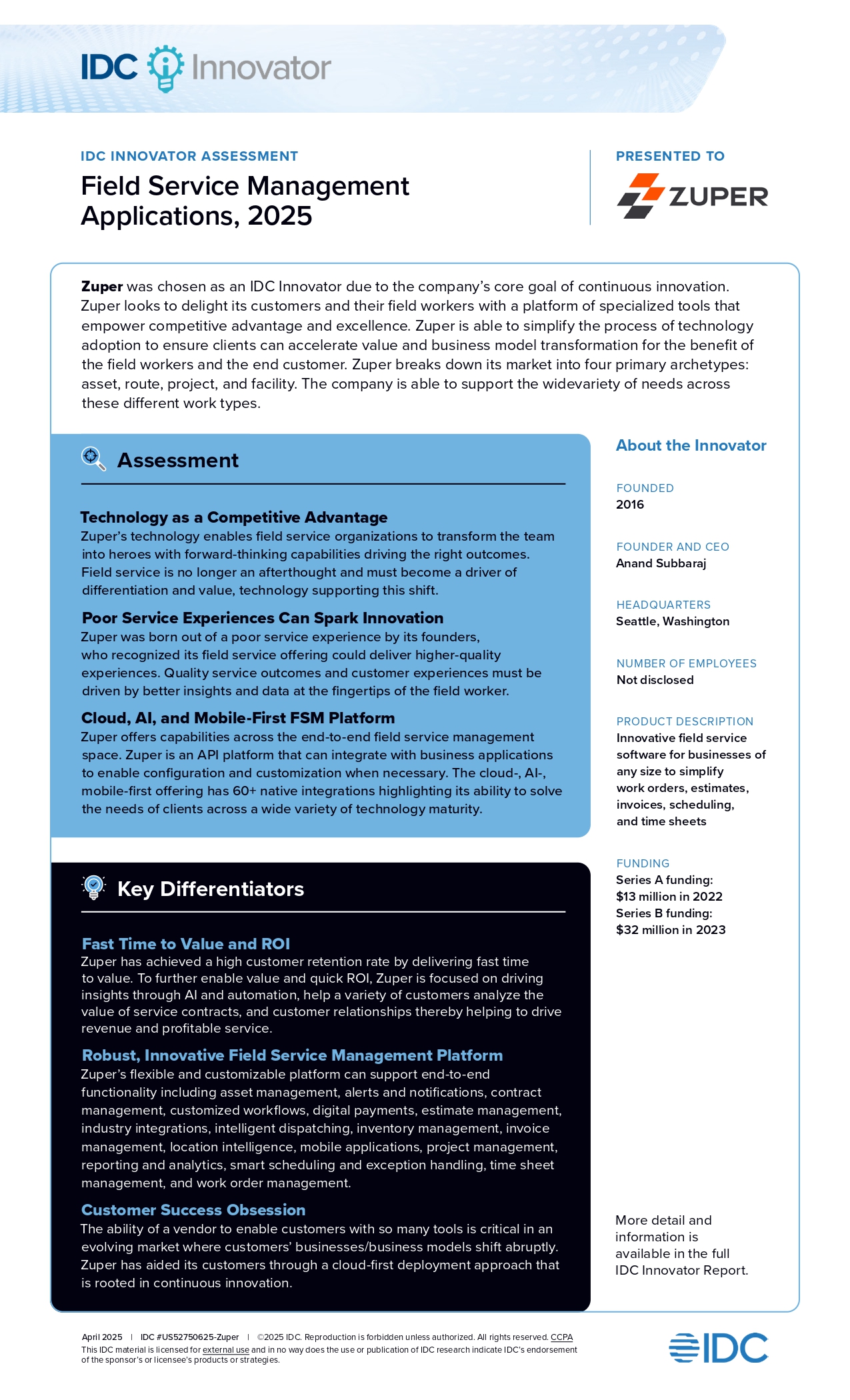Zuper has been named an IDC Innovator in the IDC Innovators: Field Service Management Applications, 2025 (doc #US52750625, April 2025) report. a recognition that reflects our continued focus on transforming how field teams operate in a digital-first world. As businesses increasingly seek modern, AI-powered tools to manage operations and enhance customer service, Zuper stands out for its intelligent, adaptable, and user-friendly platform. With 60+ integrations and rapid time to value, we’re helping companies streamline their field operations, improve efficiency, and grow on their own terms.